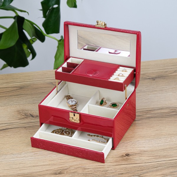 Відгуки до Шкатулка для прикрас з дзеркалом і дорожньою скринькою, поліуретанова шкіра червона 22*16.5*13 см