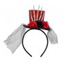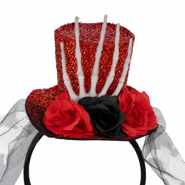 Ободок капелюшок з рукою - стильний карнавальний аксесуар у вигляді блискучого міні-капелюшка з червоними і чорними квітами, сіткою та білою рукою-кістяком.