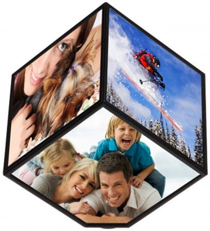 Оригінальна фоторамка у вигляді куба, що самостійно обертається. Відмінно буде виглядати і як і "сімейна фоторамка", так і ефектний і універсальний настільний гаджет з рекламним навантаженням, на який можна розмістити рекламу, лого і т.д. Працює від двох батарейок типу АА.