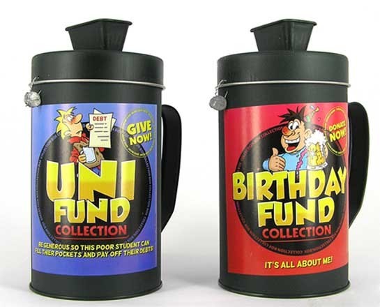 Хотите знать как выглядели первые копилки? Именно так: металлические кружки для сбора пожертвований с прорезями для монет на замочке. Добавляем прикольные надписи с картинками ,и получаем оригинальный сувенир от голландской фирмы Miko. Теперь станет гораздо проще собрать денежки на новый джип или домик в деревне :) Размеры товара,см:19х10х10
