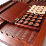 Набір по-справжньому можна віднести до наборів преміум класу, за своєї демократичної ціни, такий набір не соромлячись можна подарувати солідній людині. Матеріал Ясен. Ручна робота. Гравіювання. Розмір у розкритому вигляді 510мм на 510 мм. Комплектується фішками зі шкірою в окремій дерев'яній скриньці.