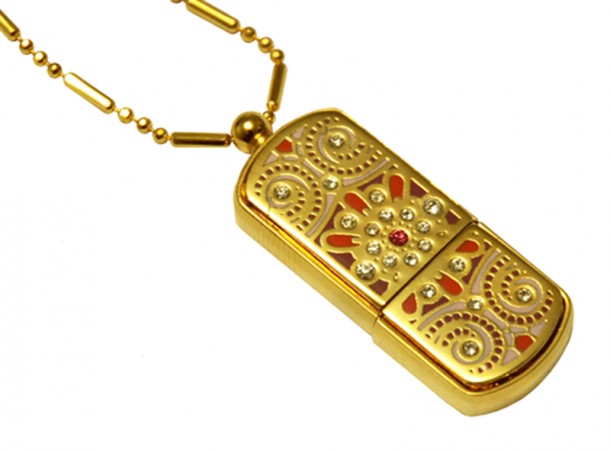 Флешка оформлена в індійському стилі, чудове поєднання витонченої прикраси на шию жінки. Компактні розміри дуже зручні, з можливістю носити завжди та скрізь із собою. Покриття золотом у 24К та оформлення кристалами Swarovski. Вологостійкий та удароміцний корпус.