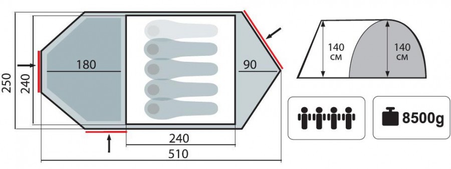 У туристичному наметі Grot В комфортно може розміститися чотири людини одночасно, а якщо трохи потісниться, тоді п'ятеро зможуть переночувати без особливих незручностей. У спальному відділенні є вікна, біля входу розташована москітна сітка. Відмінний вибір як сімейний намет.