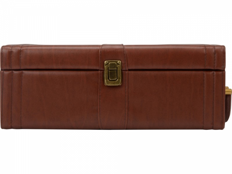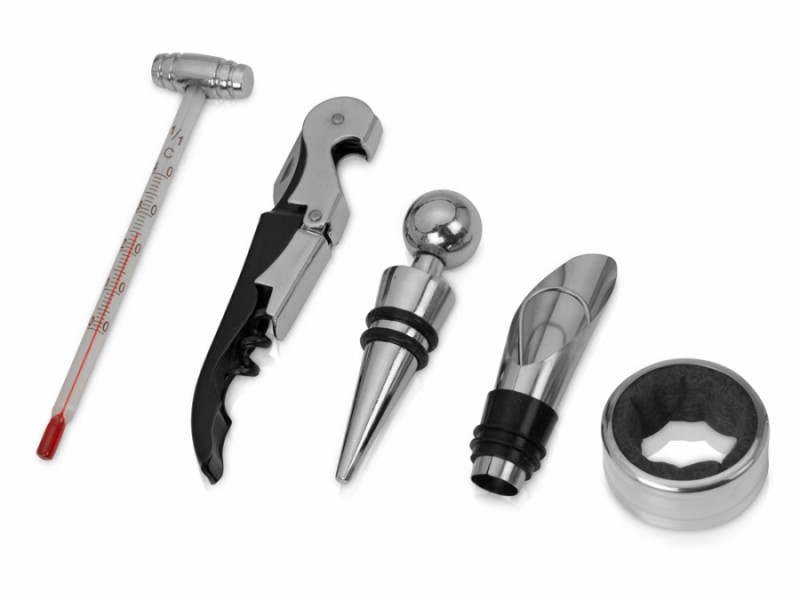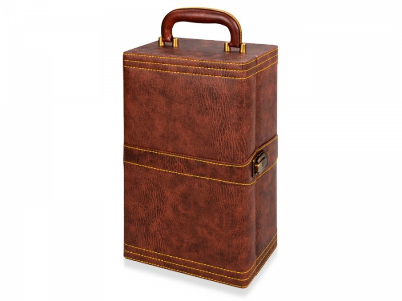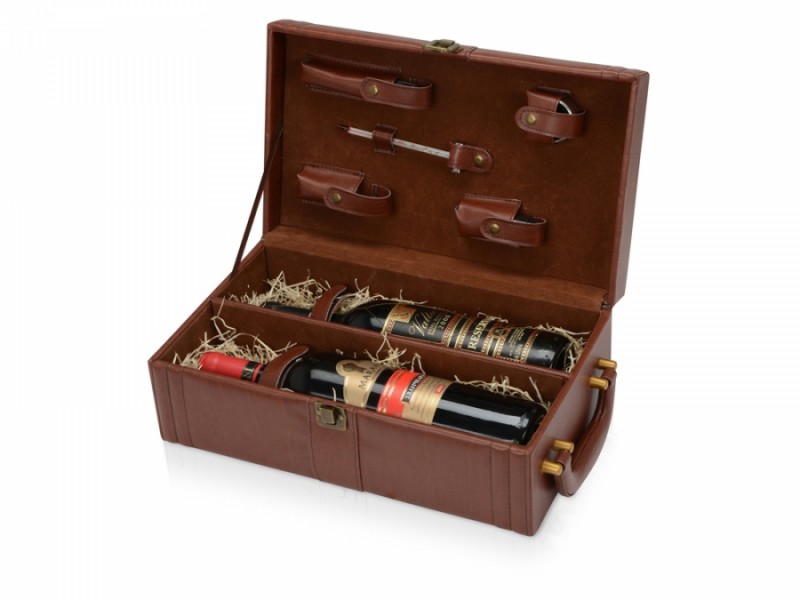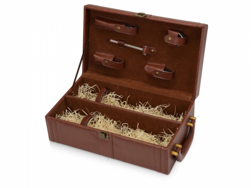 Винний набір виконаний у вигляді прямокутного кейсу, в який можна помістити дві пляшки вина. На верхній кришці розташовані аксесуари для вина, які надійно кріпляться у спеціально відведені місця на кнопці. Це дуже практично так як навіть при транспортуванні жоден з предметів сомельє не випаде.