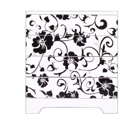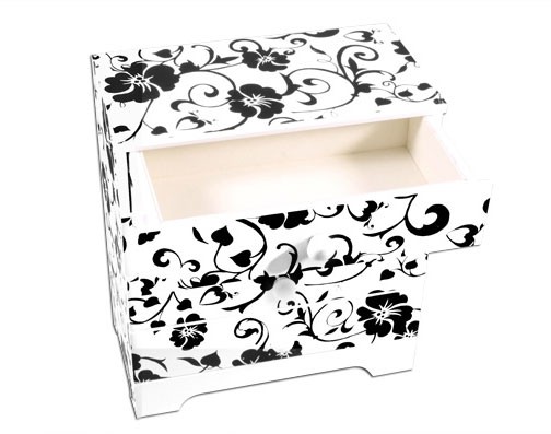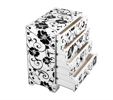 Соединение двух строгих цветов всегда считалось элегантным и модным. Четыре ящичка, два из которых разделены на секции, предназначенные для разных типов украшений – все это сделает данную модель отличным приобретением для любой девушки.