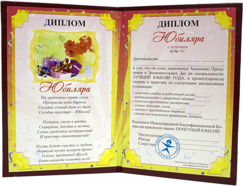 Если Вы идете на юбилей к кому то из друзей или родственников и не знаете что сказать,то подарите виновнику торжества такой диплом.Он все скажет без слов,все то что у Вас на сердце.