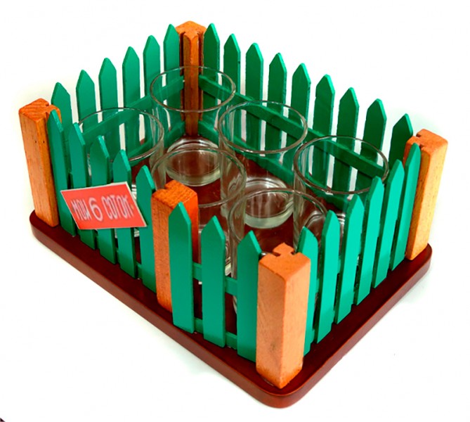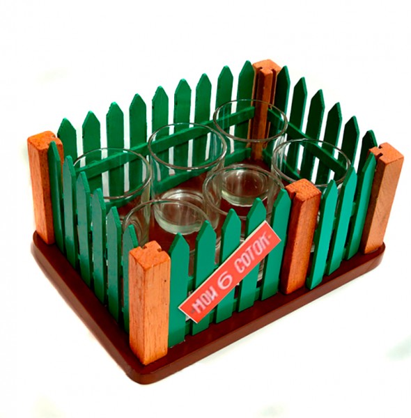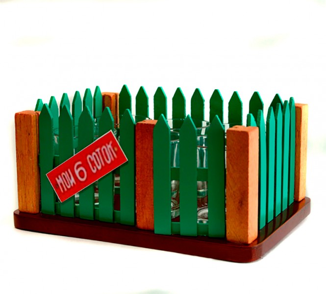 Набор 6 соток оценит дачник и человек с отличным чувством юмора. Подарок займет достойное место в вашем дачном доме и будет выручать по вечерам, когда вы с компанией единомышленников захотите обсудить будущий урожай.Отличный набор,который состоит из 6 стограммовых рюмок и и специальной подставки в виде забора.Он послужит отличным подарком для любителей провести время на даче или природе.