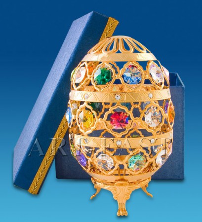 Интереснейшая статуэтка,которую можно преподнести в качестве подарка дорогому для Вас человеку.Данная фигурка это подражатель Яйца Фаберже,и при этом выглядит достаточно красиво.Небольшая скульптура имеет украшение в виде разноцветных камней от "Swarovski" и полностью покрыта золотом.Высокое качество изготовления гарантирует долговечность данной фигурки.