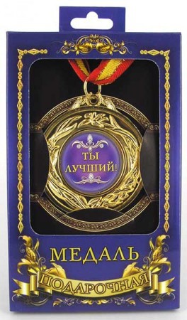 Отличный подарок любому человеку. Материал - цветной металл, двухцветная тканевая лента. На обороте медали - место для подписи и короткого пожелания. Упаковка - фирменная демо-коробка с подставкой и евро петлей.