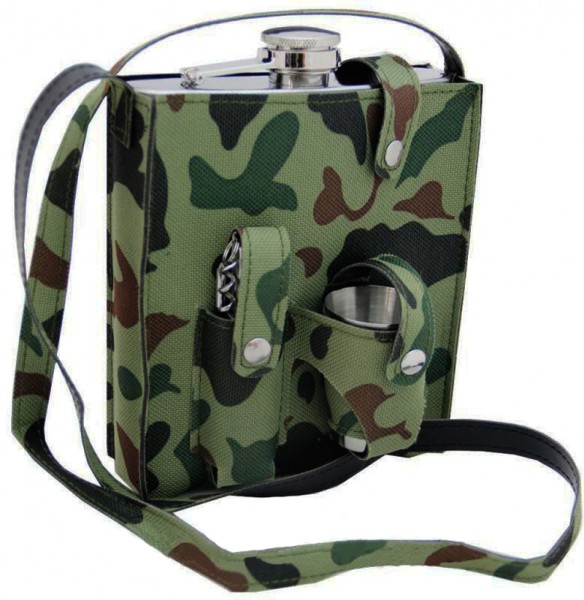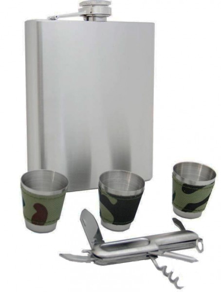 Подарочный набор в камуфляжном стиле, включает в себя флягу, три стопки ,нож. Весьма бюджетное приобретение, которое придется по вкусу любому мужчине.