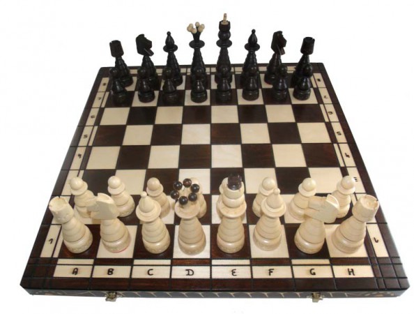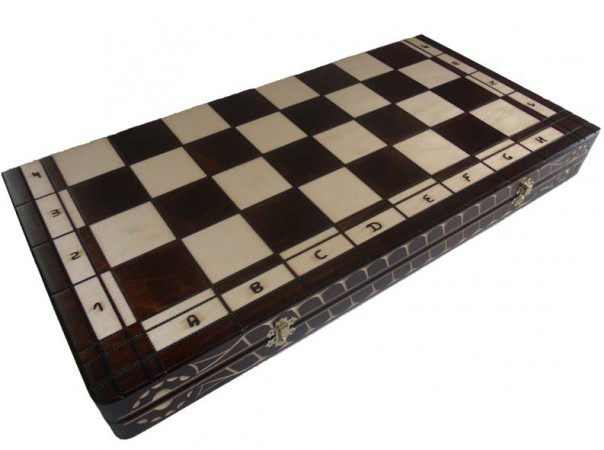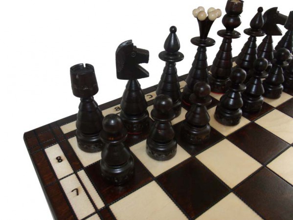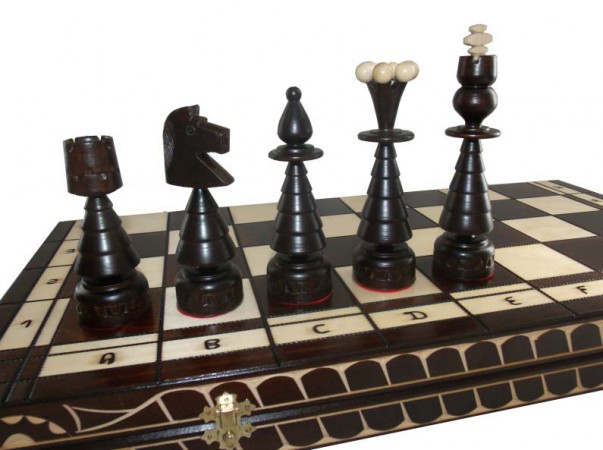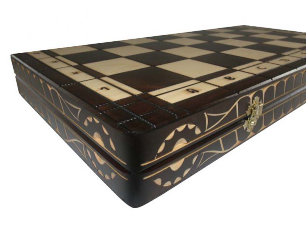 Данный комплект шахмат имеет внушительные размеры и необычный вид. Доска при раскладывании превращается в поле битвы, размер которого 60 х 60 см, торцы доски украшены резьбой, которая прекрасно сочетается с выжженными линиями, которыми доска поделена на клетки. Внутри шахматной доски присутствует бархатная ткань, также доска оснащена красивыми металлическими замочками. Деревянные фигуры по-своему уникальны, их основания по форме напоминают елки, кроме того на фигурах присутствуют элементы резьбы, высота короля 17 см. Если Вы хотите удивить друга или близкого человека, шахматы елочные выступят в роли незабываемого и оригинального подарка.