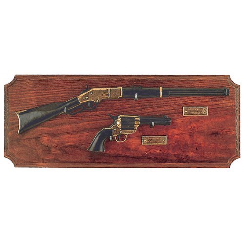 Подарочный набор, состоящий из мини-винчестера и револьвера на серой подставке.