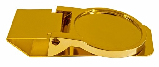 Зажим для денег Elite M839-RB золотистого цвета, оснащен мощным креплением для купюр, изготовленным из крепкой и прочной стали c формой внешней панели напоминающей циферблат фешенебельных часов.