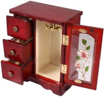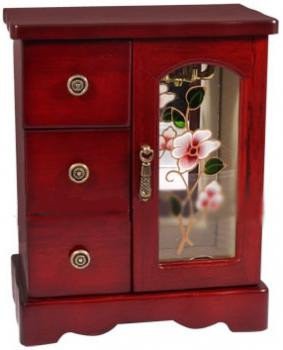 Шкафчик с тремя выдвижными ящичками отдельным креплением для хранения цепочек. На дверце отделения для цепочек и рисунок цветка.