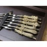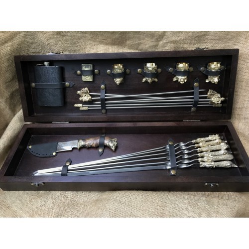 5. Шампура с рукоятью из бронзы,выполненные методом вакуумного литья покрытые теплостойким лаком, шампур изготовлен из пищевой нержавеющей стали марки 12Х18Н10Т, толщина металла шампура 10х3мм. Общая длинна шампура с ручкой 60см, Длинна шампура 50см -6шт.