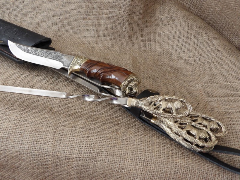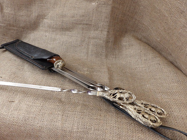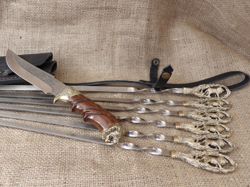 1. Шампура: 6 штук, твердая пищевая нержавеющая сталь толщиной 3мм. Длина шампура: общая - 60 см; рабочая - 50 см. Рукоять: ювелирное художественное литье из бронзы (при использовании ручка не нагревается).