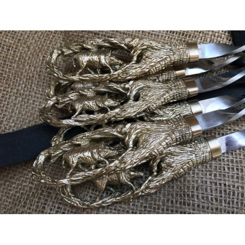 1. Шампура: 6 штук, твердая пищевая нержавеющая сталь толщиной 3мм. Длина шампура: общая - 60 см; рабочая - 50 см. Рукоять: ювелирное художественное литье из бронзы (при использовании ручка не нагревается).