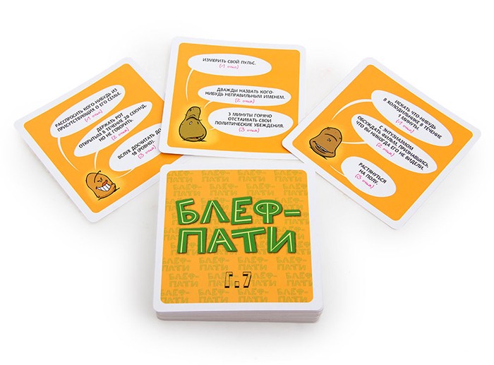 Блеф-пати напоминает старую добру игру в фанты, только в разы интереснее. Правила просты до безобразия: всем желающим достаётся по карте, которая содержит три задания. Каждое из заданий имеет свой уровень сложности, а, значит, и цену. Карточка – ваш личный указатель, показывать её остальным игрокам нельзя. Выполнять предложенные задания следует при свидетелях, но так, чтоб никто из них не догадался, что ваши действия в данный момент это и есть игра.