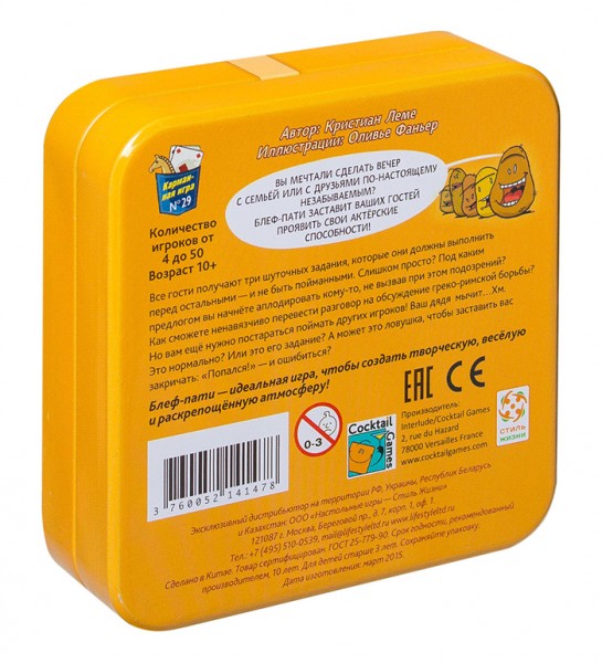 Настольная игра Блеф-пати – настоящая вечеринка, на которой нужно блефовать и веселиться, веселиться и блефовать! Это игра, в которой никаких сложных правил, никаких невероятных условий, а только интересные, умопомрачительные задания, справиться с которыми смогут самые хитрые и ловкие участники.