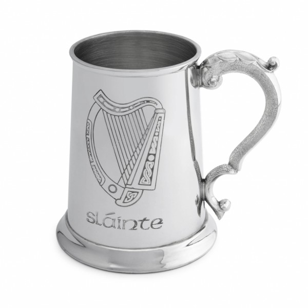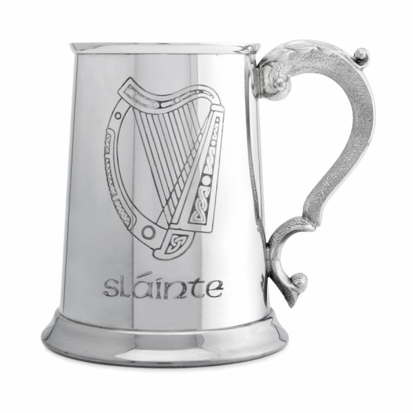 Танкард (пивная кружка) с изображением арфы. Изготовлена вручную из сплава пищевого олова. Производитель — английская компания English Pewter. Объем изделия 570 мл, вес — 0,5 кг.