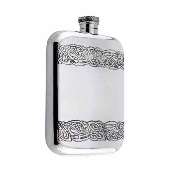 Прямоугольная фляга для спиртных напитков от торговой марки English Pewter. Объем — 180 миллилитров, вес — 0,3 килограмма, материал — пьютер (пищевое олово). Ручная работа. Фронтальная поверхность украшена кельтским орнаментом. Сделано в городе Шеффилд, Великобритания. Комплект поставки включает флягу, тканевый чехол, лейку и подарочную коробку. Полезный и памятный подарок для любого человека.