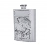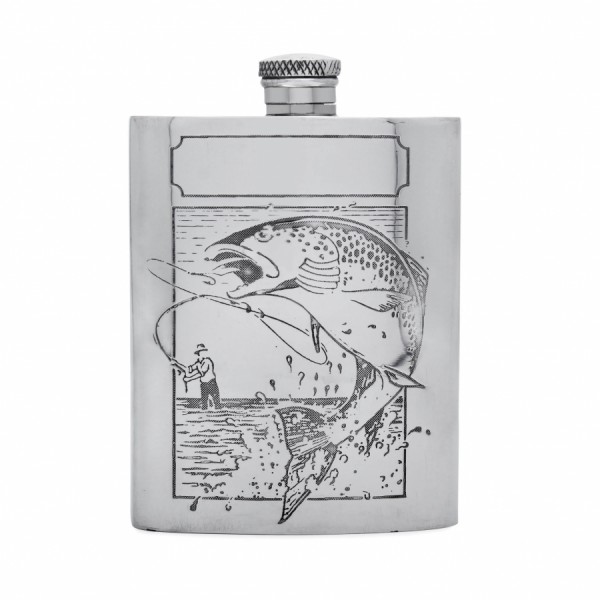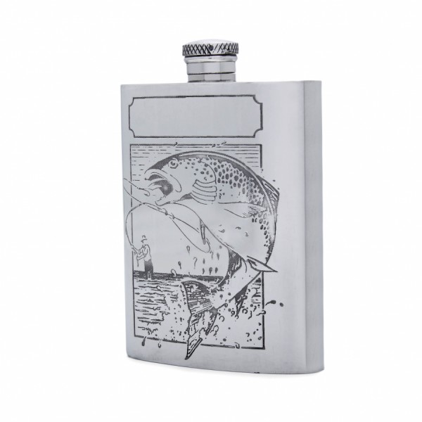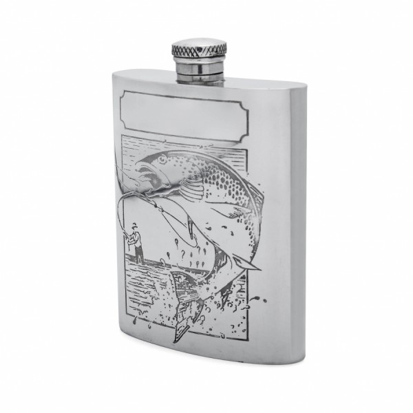Оловянная фляга для спиртных напитков. Объем 180 миллилитров, вес 0,3 килограмма. Фляга изготовлена вручную мастерами компании English Pewter. Фронтальная поверхность украшена изображением сцены рыбалки. Сделано в Великобритании. Комплект поставки включает флягу, вельветовый чехол, лейку и подарочную коробку. Прекрасный подарок для рыболовов.