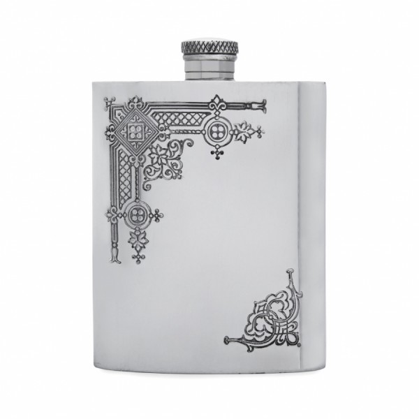 Фляга с гравюрой в готическом стиле станет отличным подарком для любого случая. Поверхность оловянного корпуса гладкая, благодаря физическим свойствам металла, не темнеет и не теряет своей привлекательности. Кроме оригинального дизайна, фляга имеет вполне практическое применение и вмещает до 180 мл (или 6 унций) любимого спиртного напитка. Флягу удобно носить как в сумке, так и просто в кармане. Изделие поставляется в красивой бежево-черной фирменной упаковке.