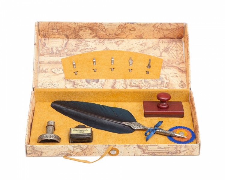 Набор упакован в элегантный футляр с приятным бархатным покрытием, что придает роскоши и уникальности выбранному вами набору. Перо закреплено тонкой атласной лентой, точно подходящей в тон.