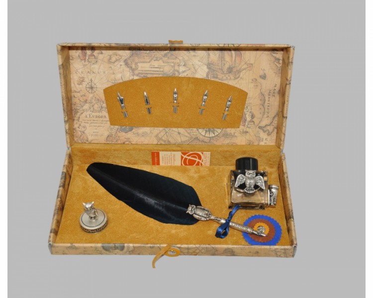 Набор упакован в элегантный футляр с приятным бархатным покрытием, что придает роскоши и элегантности выбранному вами набору. Перо закреплено тонкой атласной лентой, точно подходящей в тон.