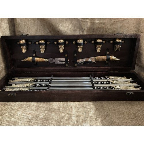 Шампура с рукоятью из бронзы,выполненные методом вакуумного литья покрытые теплостойким лаком, шампур изготовлен из пищевой нержавеющей стали 12Х18Н10Т, толщина металла шампура 10х3мм.