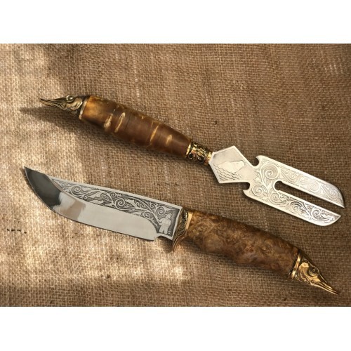 Вилка для снятия мяса изготовлена из нержавеющей стали 40х13 и рукояти из дерева клен,с бронзовым литьем.