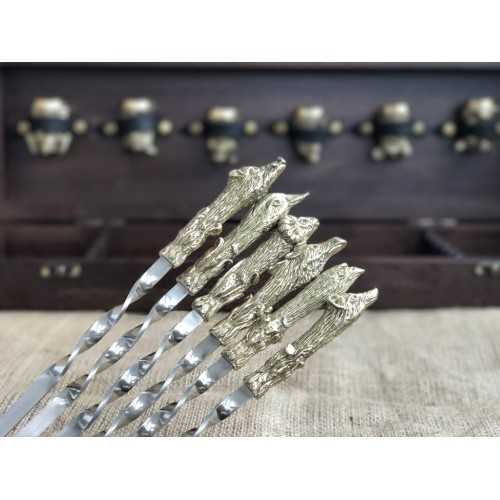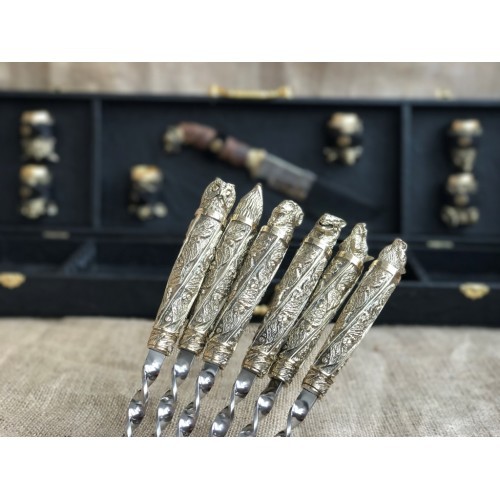 4. Шампура с рукоятью из бронзы,выполненные методом вакуумного литья покрытые теплостойким лаком, шампур изготовлен из пищевой нержавеющей стали 12Х18Н10Т, толщина металла шампура 10х3мм. Общая длинна шампура с ручкой 70 см, Длинна шампура 60 см -6 шт.