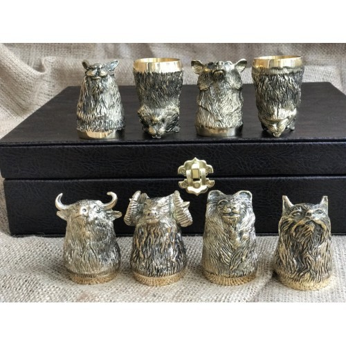1. Рюмка Охотничья 8 шт: художественное литье из бронзы, внутри покрытые пищевым булатом. Высота 70 мм, ширина 40 мм, объем 30 мл, вес 220 грамм. Кабан, Медведь, Лось, Сова, Рысь, Баран и другие.