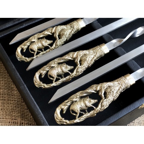 4. Шампура с рукоятью из бронзы,выполненные методом вакуумного литья покрытые теплостойким лаком, шампур изготовлен из пищевой нержавеющей стали 12Х18Н10Т, толщина металла шампура 10х3 мм. Общая длинна шампура с ручкой 60 см, Длинна шампура 50 см -6 шт.