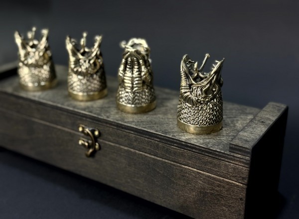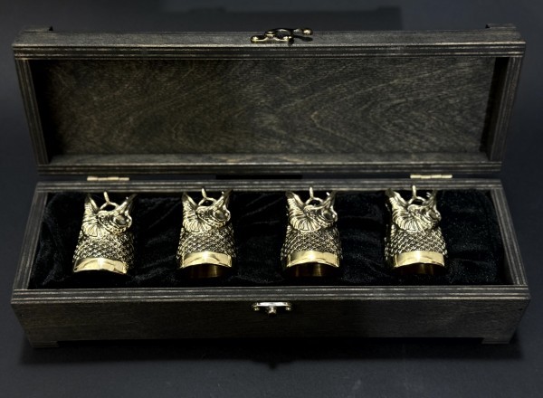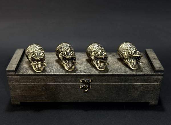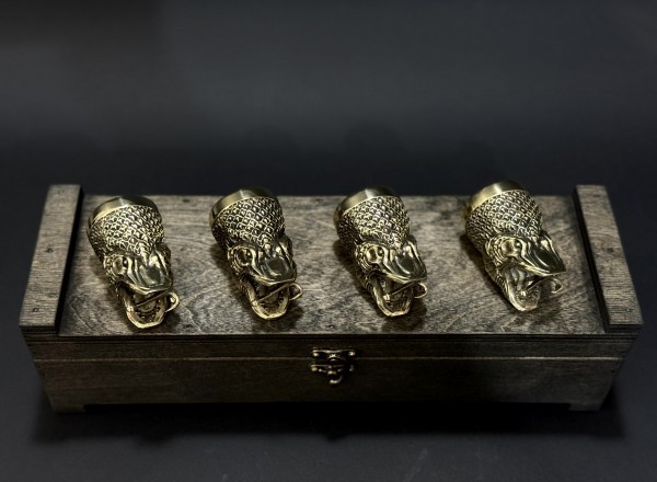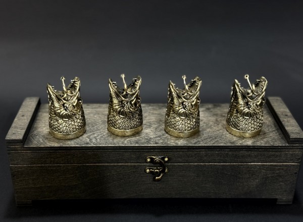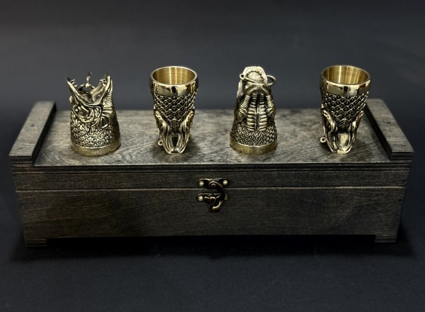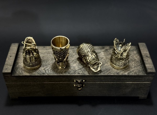 1. Рюмка Щука: художественное литье из бронзы, внутри покрытые пищевым булатом. Высота 70 мм, ширина 40 мм, объем 30 мл, вес 220 грамм.