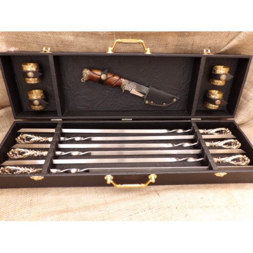 4. Шампура с рукоятью из бронзы,выполненные методом вакуумного литья покрытые теплостойким лаком, шампур изготовлен из пищевой нержавеющей стали 12Х18Н10Т, толщина металла шампура 10х3мм. Общая длинна шампура с ручкой 60см, Длинна шампура 50см -6шт.