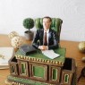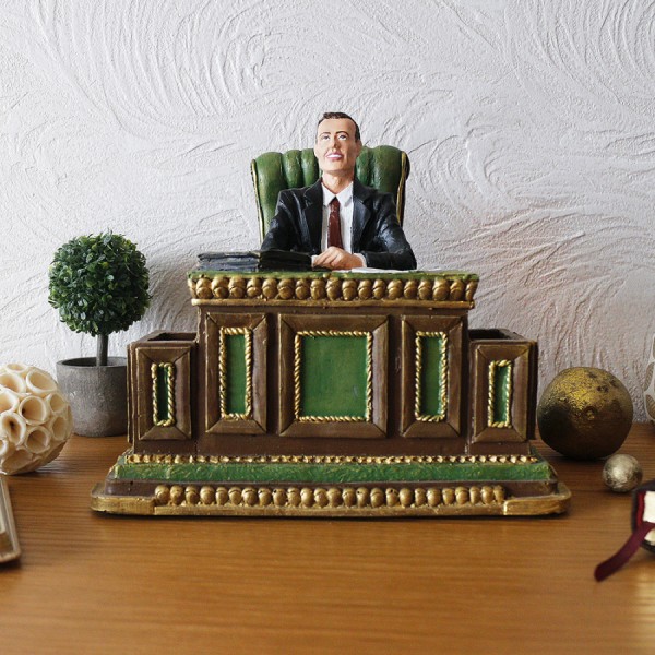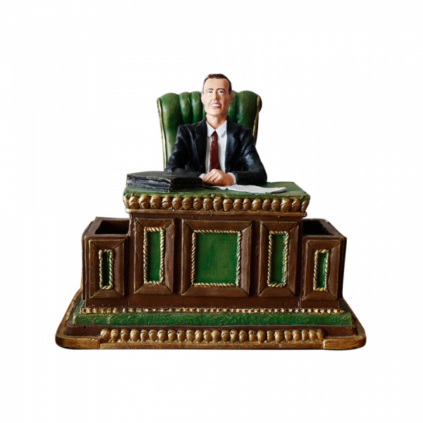 Визитница изготовлена из полимерного материала, ее высота – 22 см. Для визиток есть два специальных отделения по бокам стола. Статуэтка шикарно смотрится на письменном столе, или в интерьере кабинета. Купить необычный подарок бизнесмену, шефу, директору по приемлемой цене Вы можете на нашем сайте.