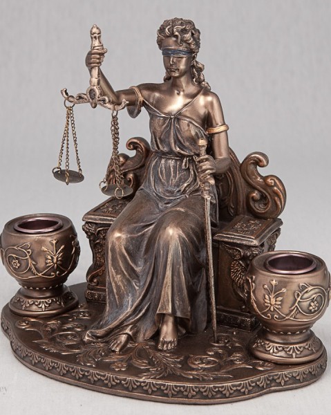 Атрибуты Фемиды - разящий меч, весы и повязка на глазах.