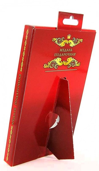 На обороте медали - место для подписи и короткого пожелания. Упаковка - фирменная демо-коробка с подставкой и евро петлей.