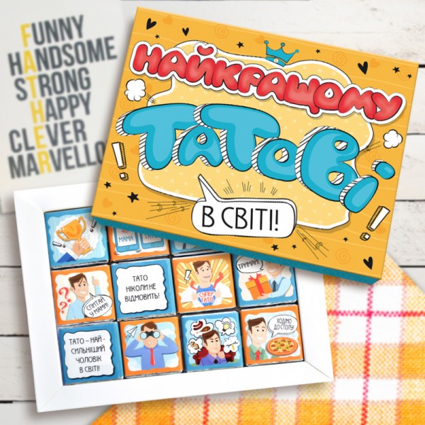 Шоколадный набор с весёлыми иллюстрациями и комментариями заставят улыбнуться отца.