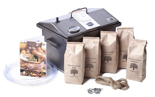 В комплект входят: 2 решетки (можно использовать одну), поддон для стекания жира, инструкция, опилки. Каждая коптильня в индивидуальной упаковке.