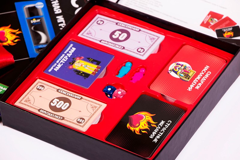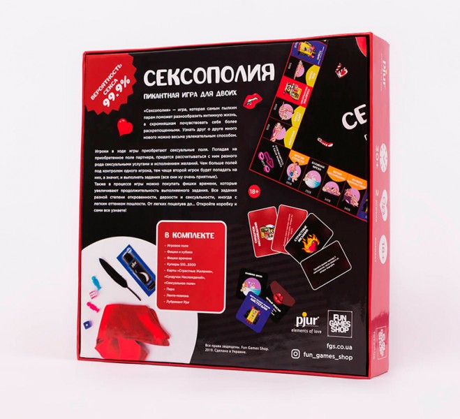 Коротко о правилах: Игроки в ходе игры приобретают сексуальные поля. Попадая на приобретенное поле партнера, придется рассчитываться с ним разного рода сексуальными услугами и исполнением желаний. Чем больше полей под контролем одного игрока, тем чаще второй игрок будет попадать на них, а значит, и выполнять задания (все они ну очень приятные). Также в процессе игры можно покупать фишки времени, которые увеличивают продолжительность выполняемого задания. Все задания разной степени откровенности, дерзости и сексуальности, иногда с легким оттенком пошлости. От легких поцелуев до... Откройте коробку и сами все узнаете!