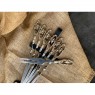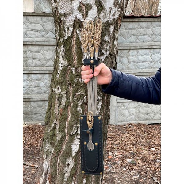 Лезвия шампуров изготовлены из пищевой нержавейки толщиной 3 мм ,ширина 10мм длина 500мм. Размер является универсальным для любого Мангала. Ручки,литые из бронзы,не потеряют свой вид спустя годы,и так же будут радовать своего владельца.Вилка в наборе изготовлена из нержавеющей стали 40х13