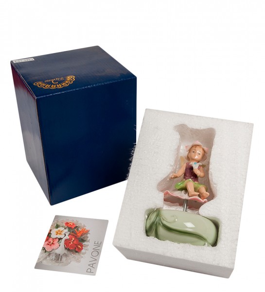 Статуэтка маленькая девочка с ангельскими крылышками, сидящая на розовом цветке и зажавшая в руке другой цветок, поменьше – это настоящая цветочная фея. У нее и шляпа на голове – тоже из цветочных лепестков. Она – настоящая волшебница: стоит ей сделать повелительный жест своей маленькой ручкой, и она вместе со своим цветком закружится в плавном танце. Это – музыкальная шкатулка, в которой красота композиции дополняется красотой звучащей мелодии. Подарить ее можно с пожеланием вечной весны и тепла, чтобы в жизни было много цветов и музыки, а цветочная фея стала ангелом-хранителем на всю счастливую жизнь.