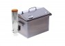 Двухъярусная коптильня для горячего копчения с гидрозатвором и термометром. Эта коптилка больше всего подойдет небольшой семье или кампании. За 1 загрузку дымница выдает до 4 кг копченостей. Пару часов в маринаде, до часа в коптилке – и дымные вкусности у вас на столе. Для копчения понадобится всего одна засыпка щепы, удобство контроля за процессом обеспечит встроенный термометр.