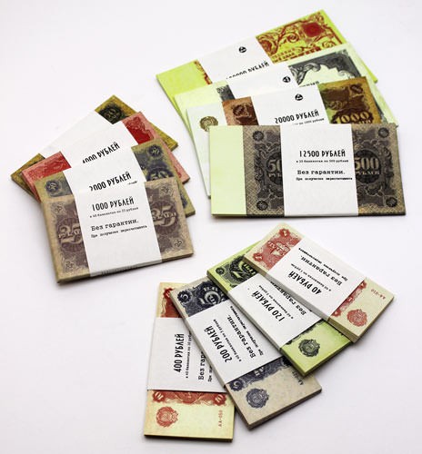 Деньги — аутентичные рубли 1922 года, уменьшенные на 1/3 с сохраненным соотношением размеров купюр.