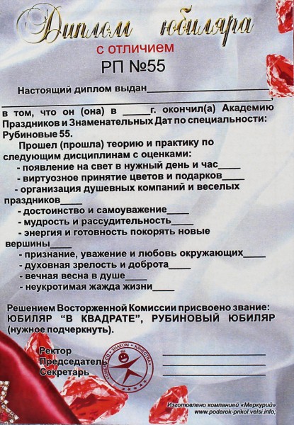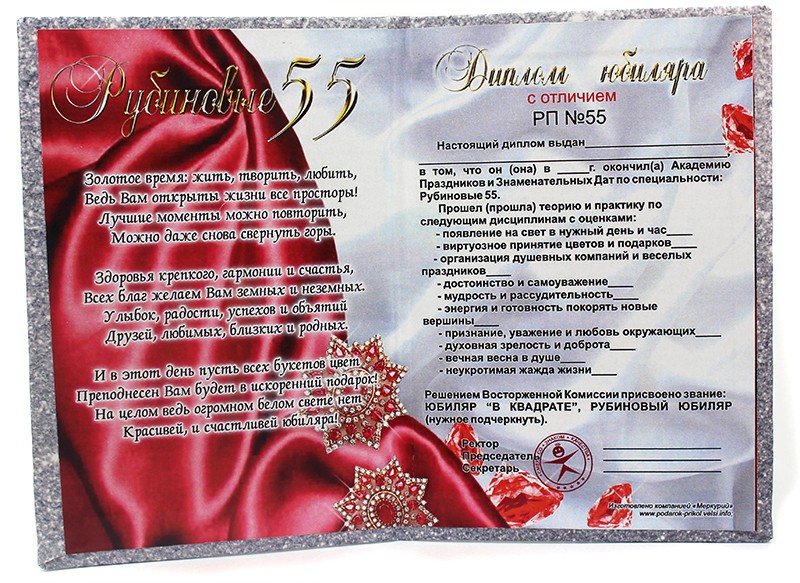 Диплом юбиляра Рубиновые 55