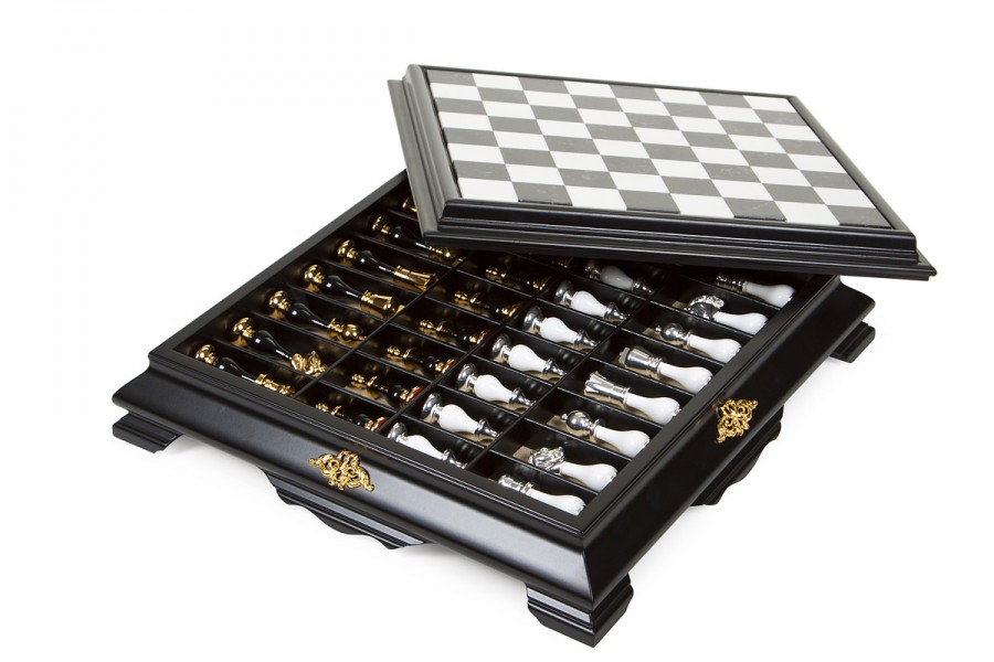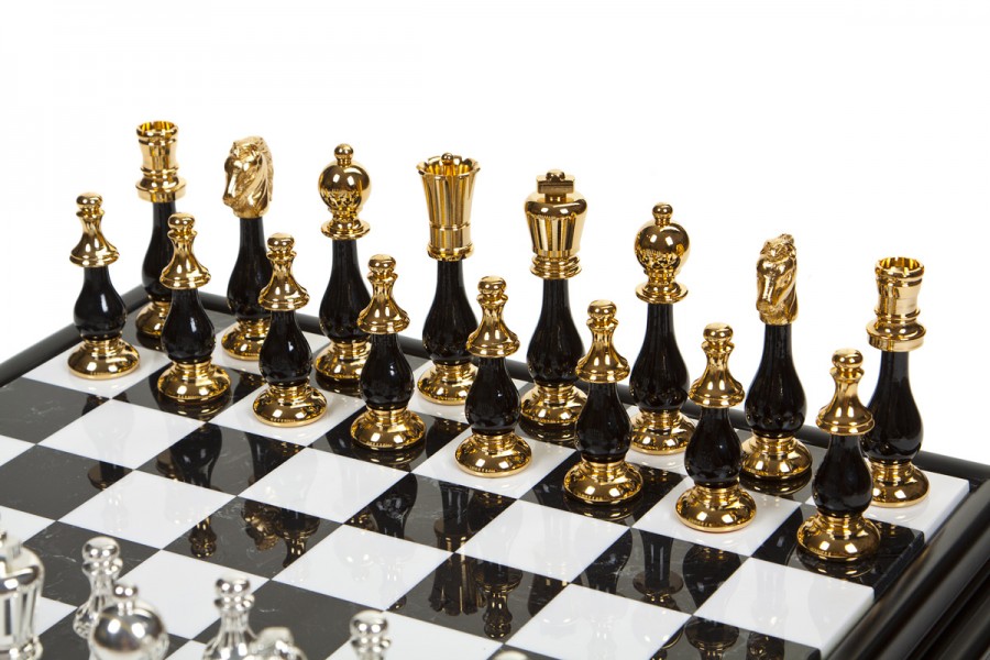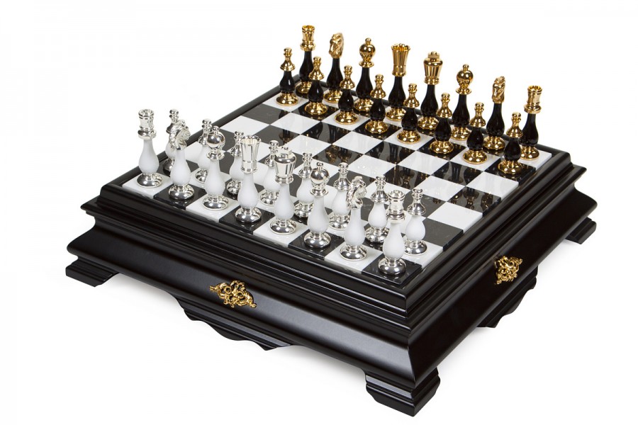 Шахматы всемирно известного итальянского бренда Italfama. Доска изготовлена из дерева и мрамора с выдвижной шухлядкой для хранения фигурок. Фигурки изготовлены из латуни + позолота 24К и серебро 990 пробы.