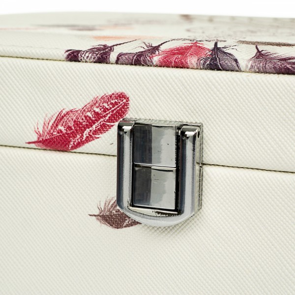 Оригинальная и красивая шкатулка для любительниц украшений . Сделана из кожзаменителя, внутри есть зеркальце, кармашек и множеством отделений. Все это поможет упорядочить и всегда найти то или иное украшение на своем месте. Закрывается на замок-защелку, что очень удобно при транспортировке. Такая шкатулка поможет сохранить ваши вещицы и стать незаменимым предметом интерьера и хорошим подарком.
