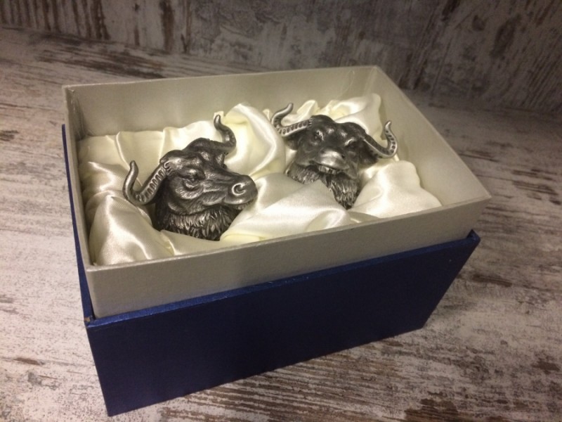 Оригинальный набор из двух рюмок перевертышей в виде головы буйвола станет отличным подарком. Голова оленя изготовлена из сплава меди и олова. Сама рюмка из высококачественного стекла. Рюмки упаковываются в подарочную коробку и фирменный пакет.